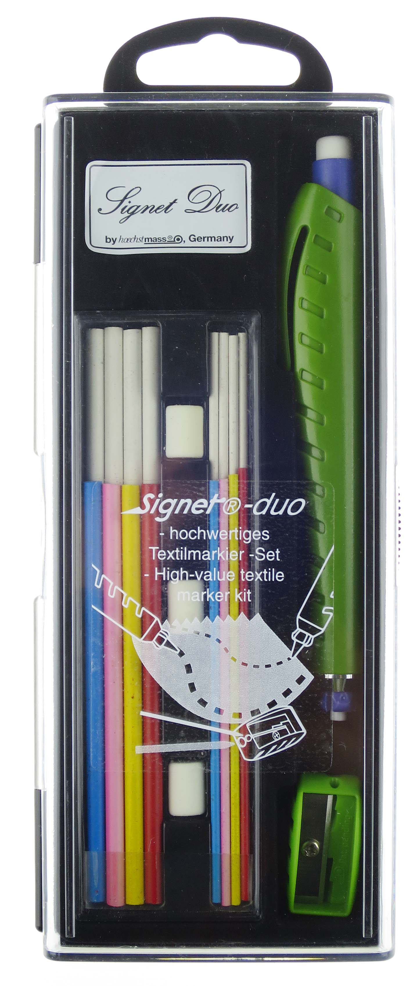 Textilmarkier-Set zum Markieren und Anzeichnen auf Textilien und andere Materialien mit 2 unterschiedlichen Minenstärken: 2 mm und 3,8 mm.