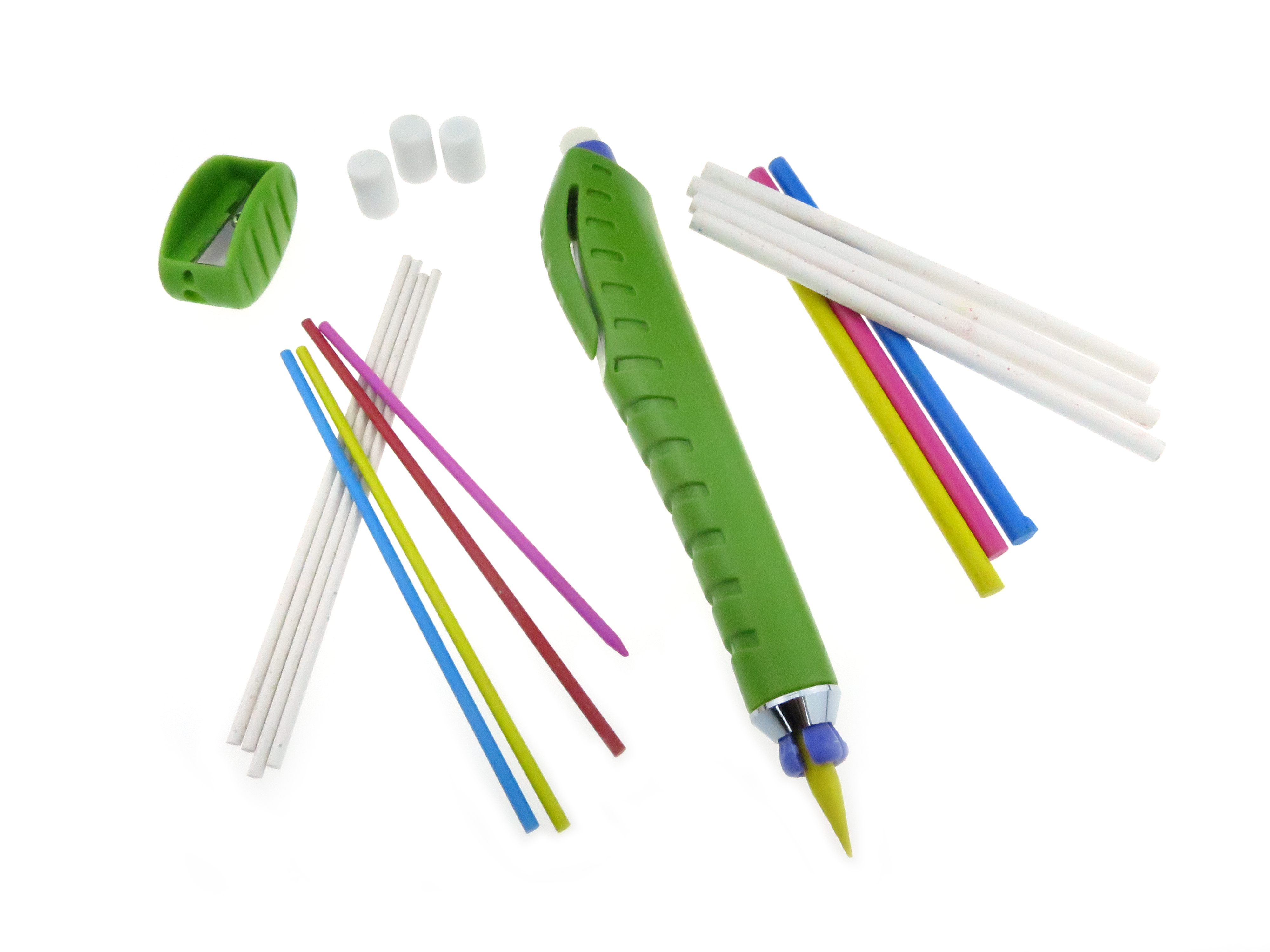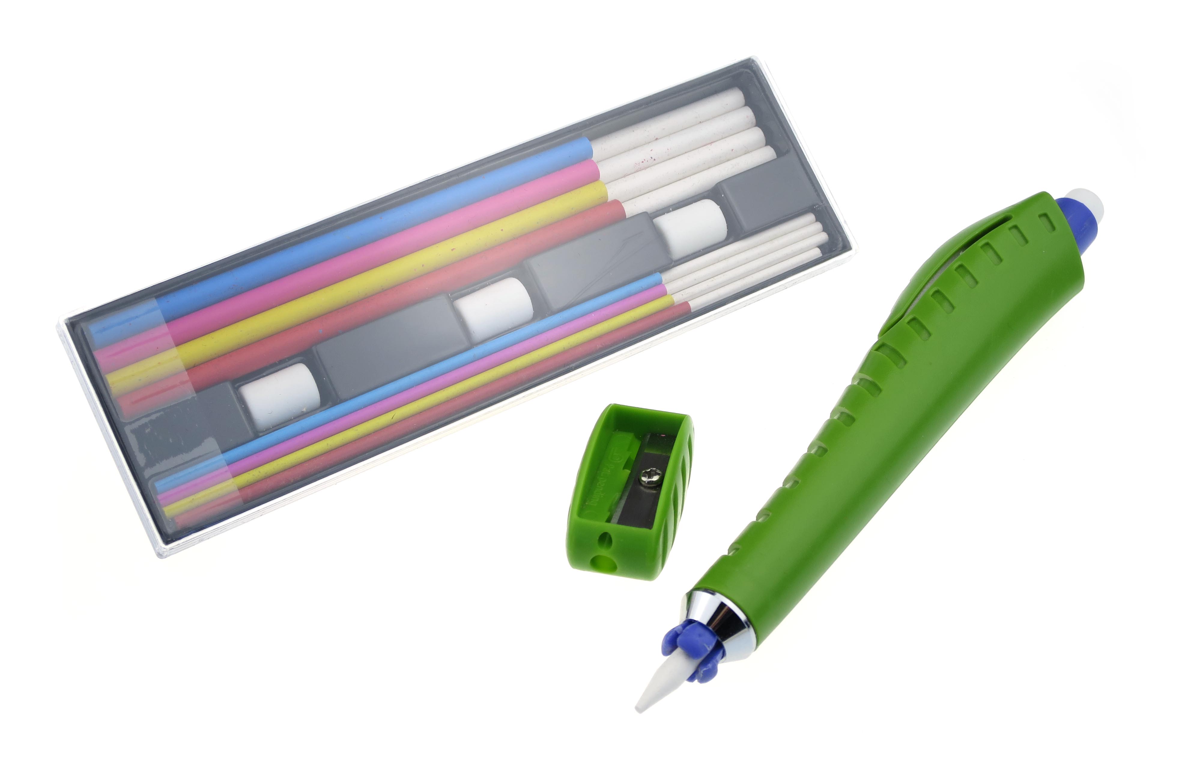 Enthält einen Minenhalter, 4 Radiergummis, je 8 Minen in 2,0 mm Stärke und 3,8 mm Stärke und einen Spitzer.
