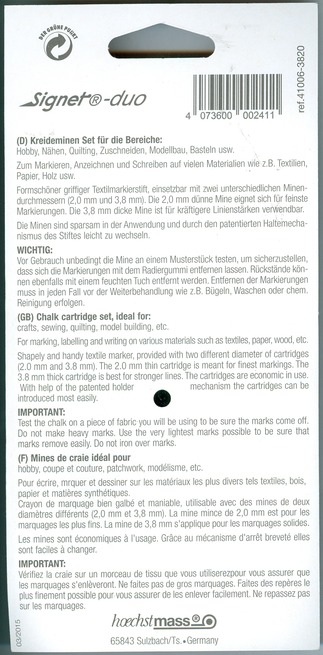 Vor Gebrauch unbedingt die Mine an einem Musterstück testen um sicherzustellen, dass sich die Markierungen mit dem Radiergummi entfernen lassen. Rückstände können ebenfalls mit einem feuchten Tuch entfernt werden. Entfernen der Markierungen muss in jedem Fall vor der Weiterbehandlung wie z.B. Bügeln, Waschen oder chemischer Reinigung erfolgen!
