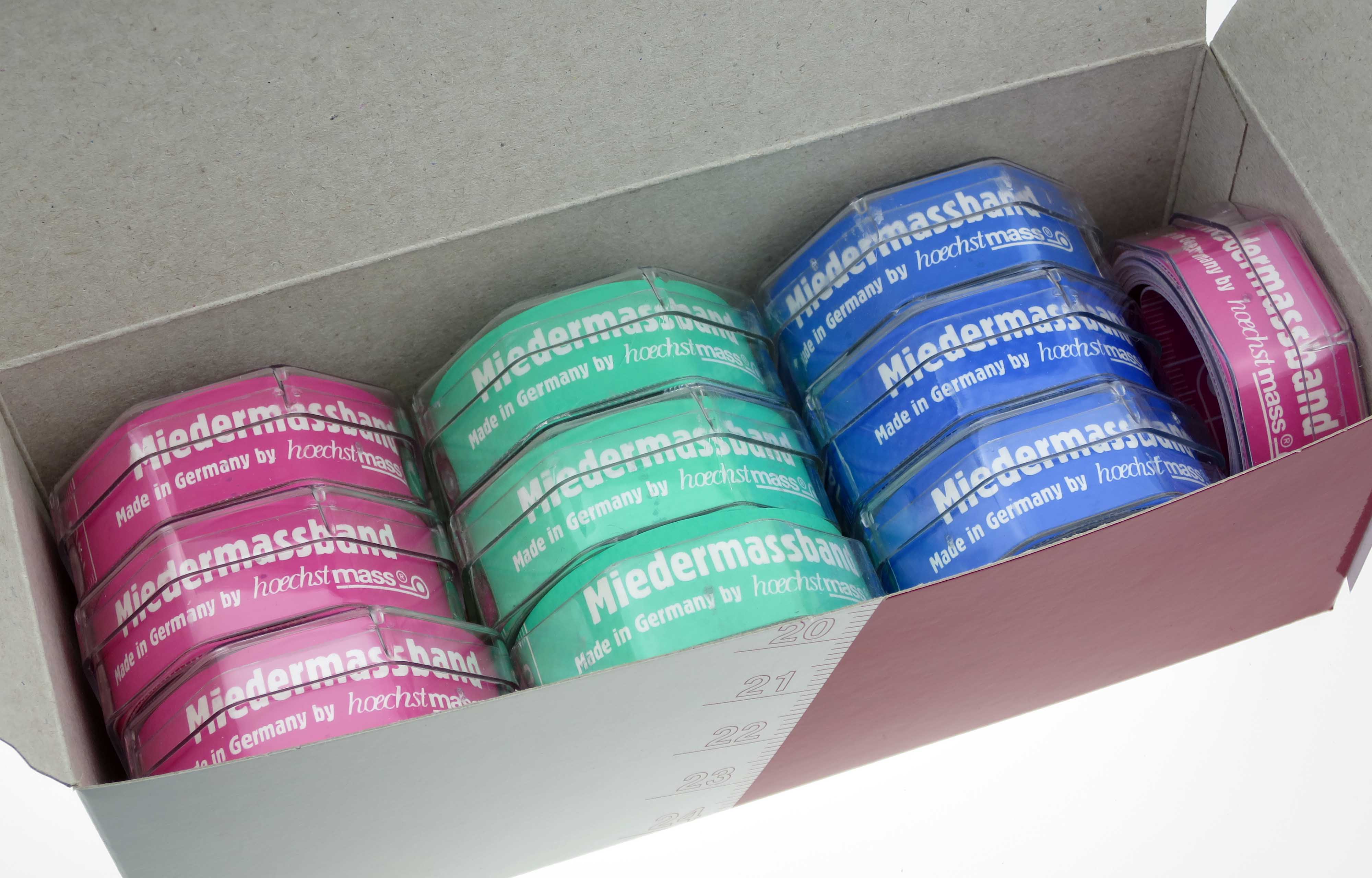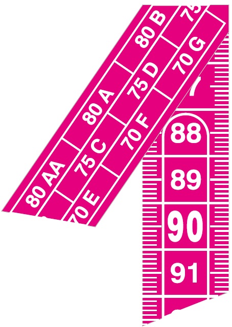 Maßband speziell zum Messen von BH-Größen - Grundfarbe, grün, pink oder blau. Eine Seite mit cm-Skala und