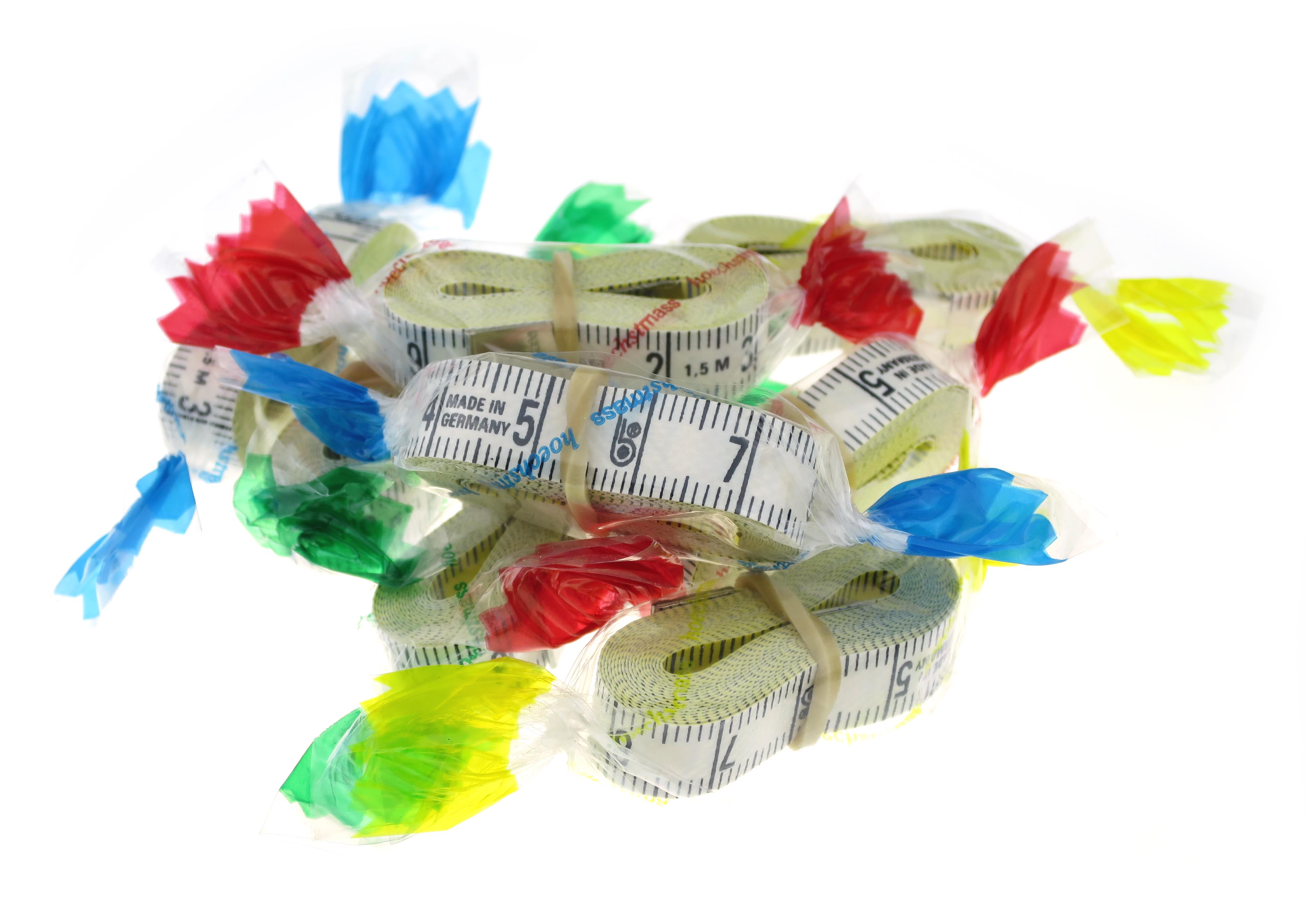 Das 10 mm breite Maßband ist auch im Bonbonpapier erhältlich, ideal als kleines Kundenpräsent.