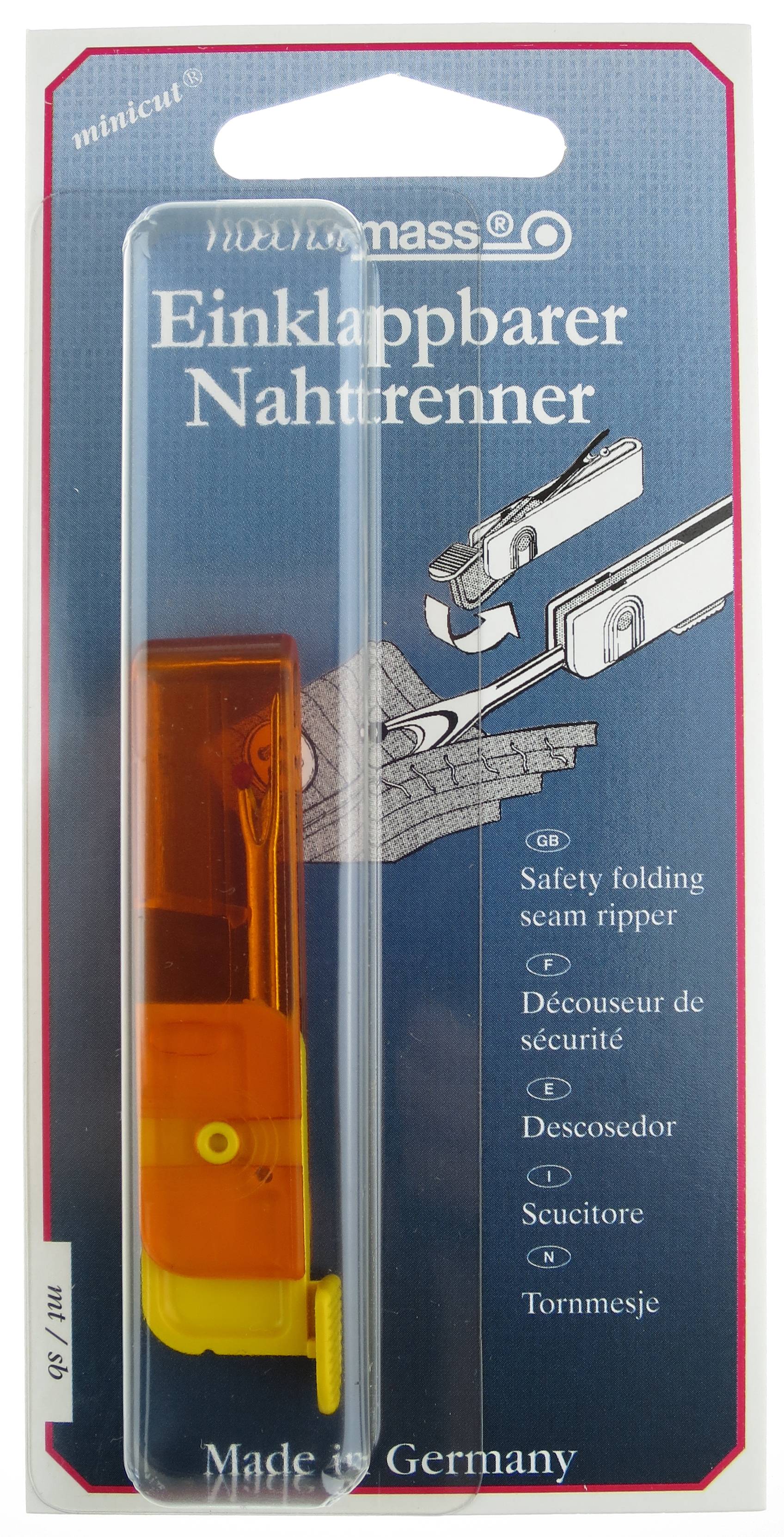 Praktischer Sicherheits-Nahttrenner mit einklappbarer Klinge für vielseitige Einsatzmöglichkeiten.