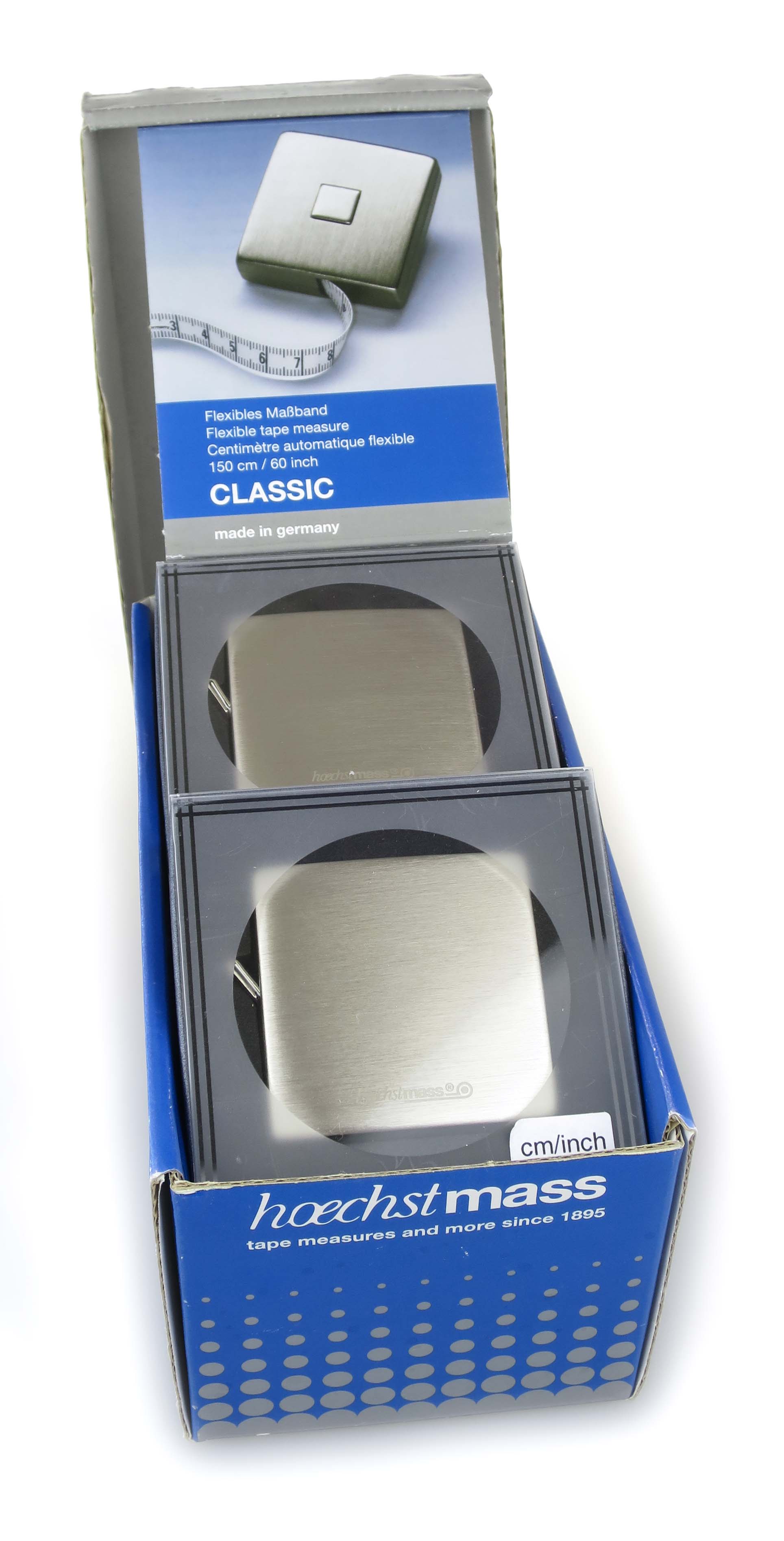 Maßband: Poly-Fibre Qualtität, beidseitig weiss mit Maßeinteilung in schwarz.