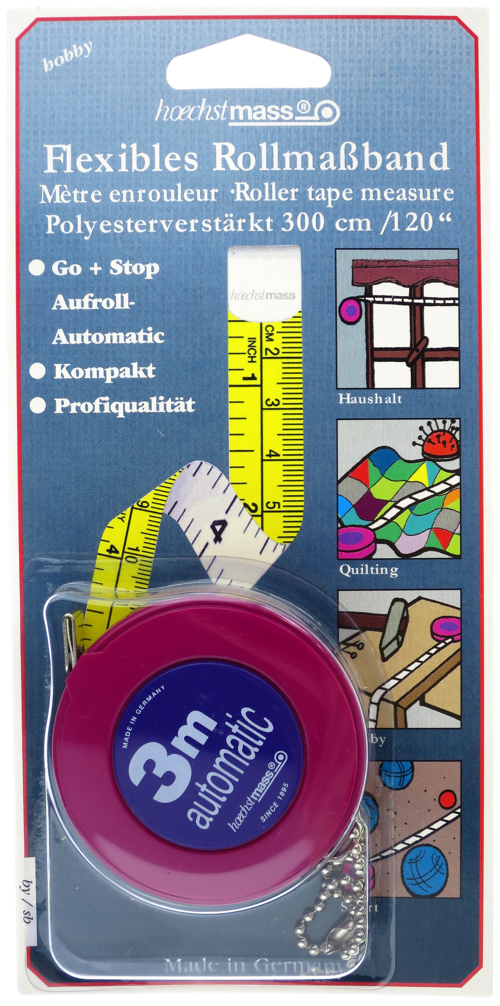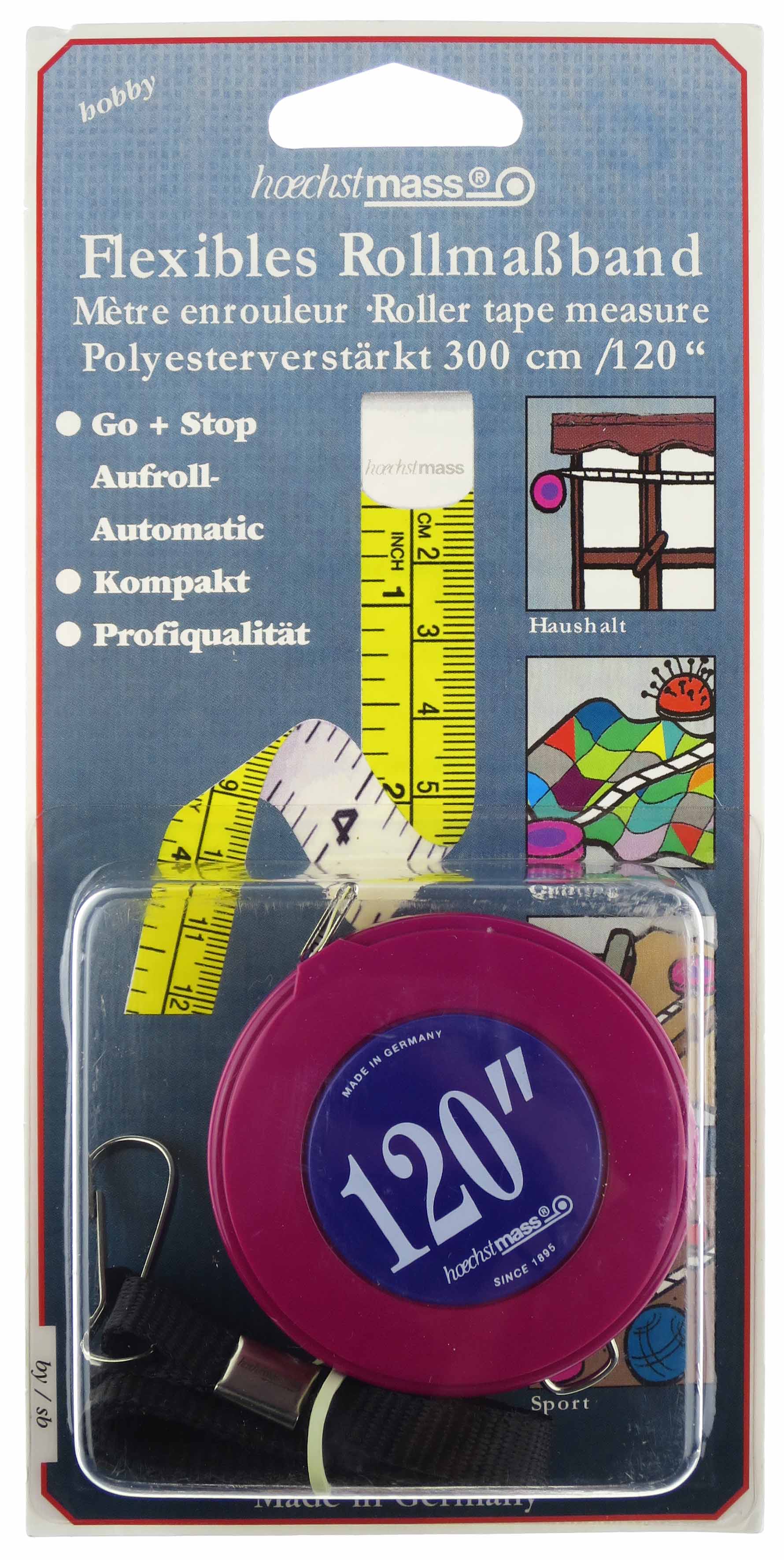 Superlanges Taschen-Rollmaßband. Das Einzige mit 300 cm Länge. Zuverlässige, bewährte Stop/Go Automatik, patentiert.