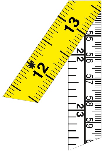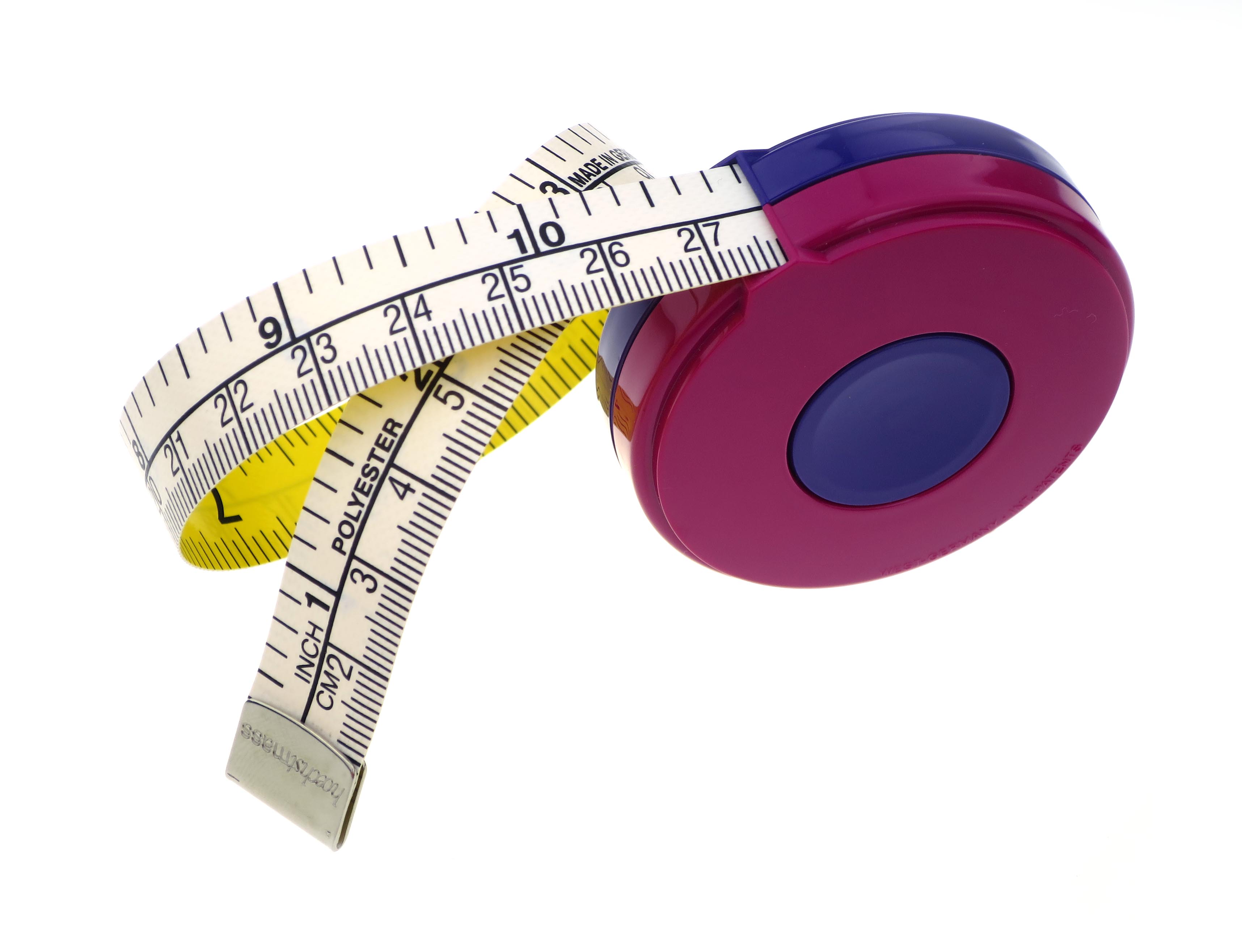 Maßband Poly-Fibre Qualität, eine Seite weiß, andere Seite gelb mit beidseitiger Maßeinteilung in schwarz.