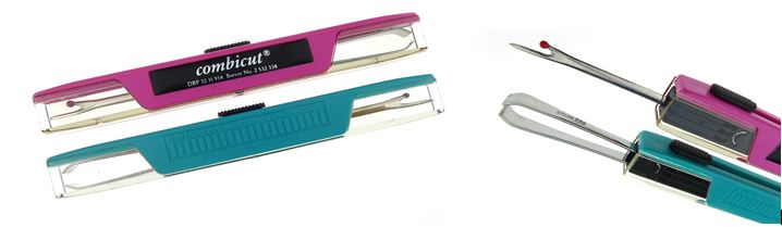 Nahttrenner und Pinzette in elegantem, kompaktem Handteil. Die hochwertigen Instrumente lassen sich mit einer Fingerbewegung ausschieben und bleiben durch Kugelrasterung in Gebrauchsstellung fixiert.
