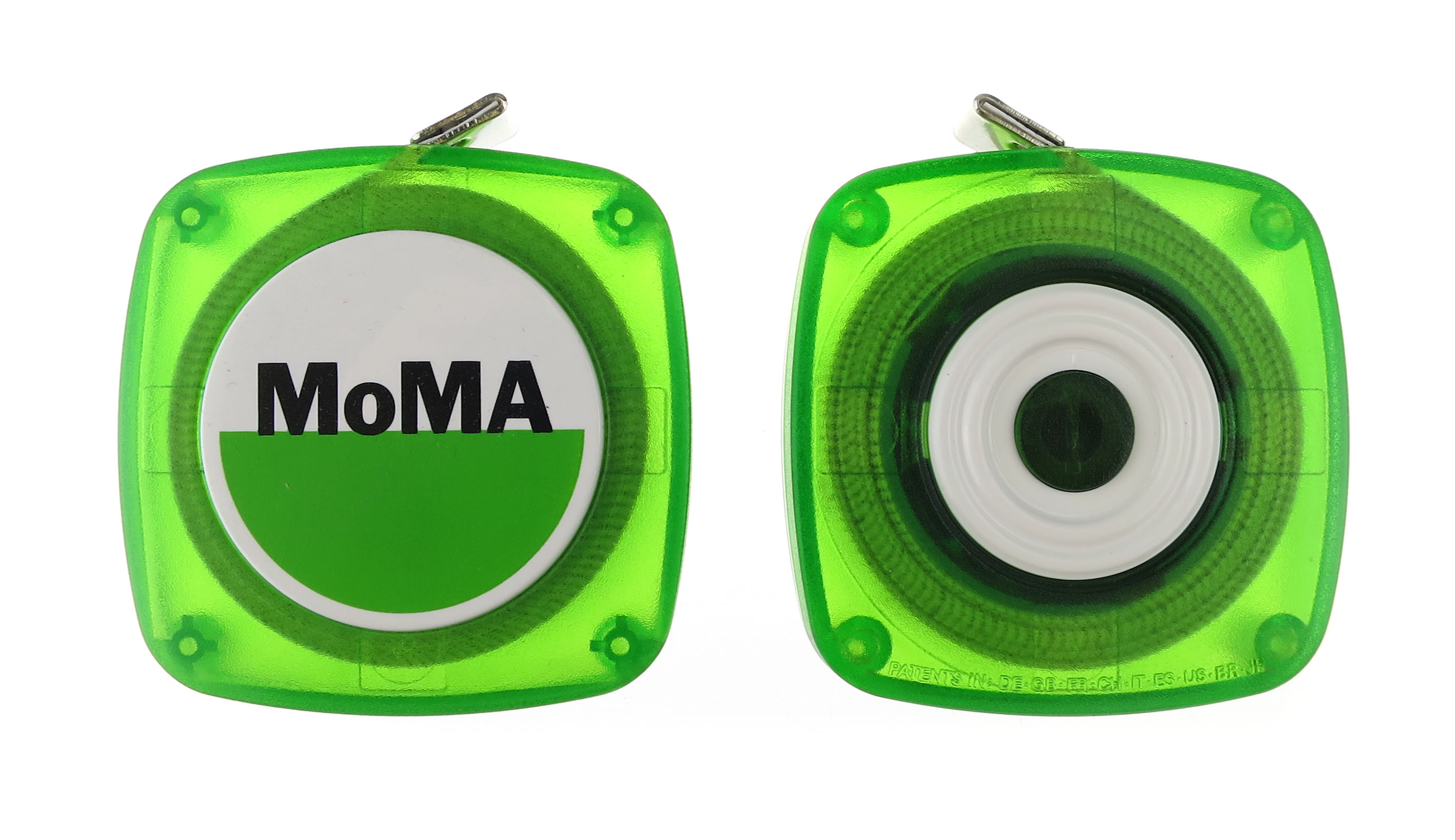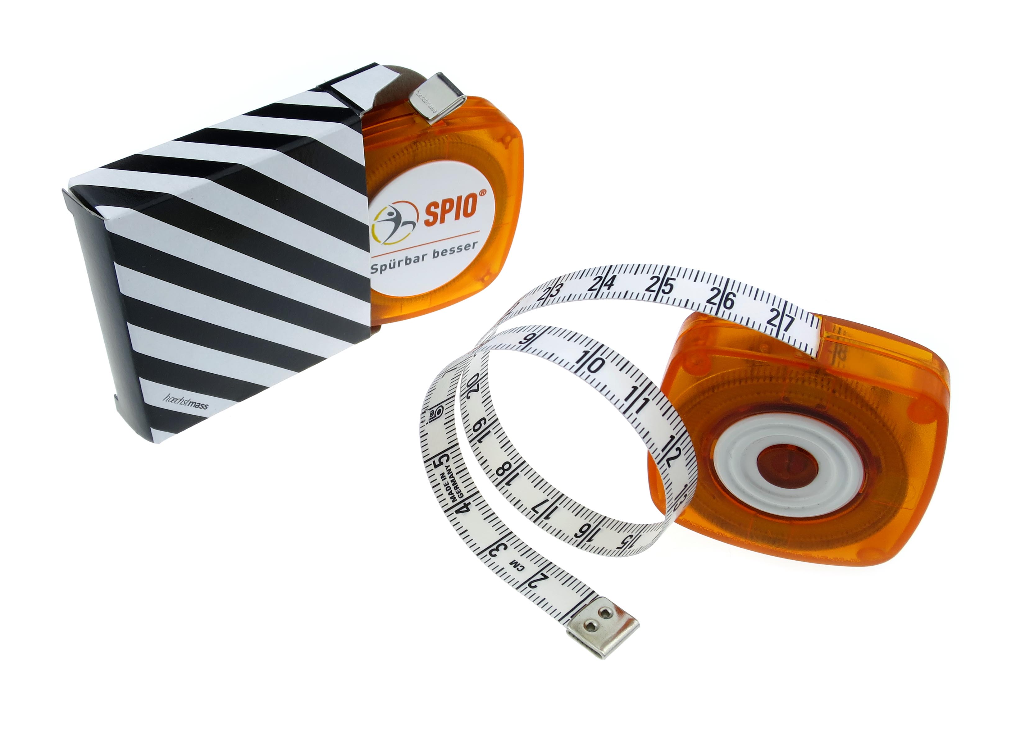 Flexibles Rollmaßband mit patentierter Go/Stopp Automatik, mit großer Werbefläche.