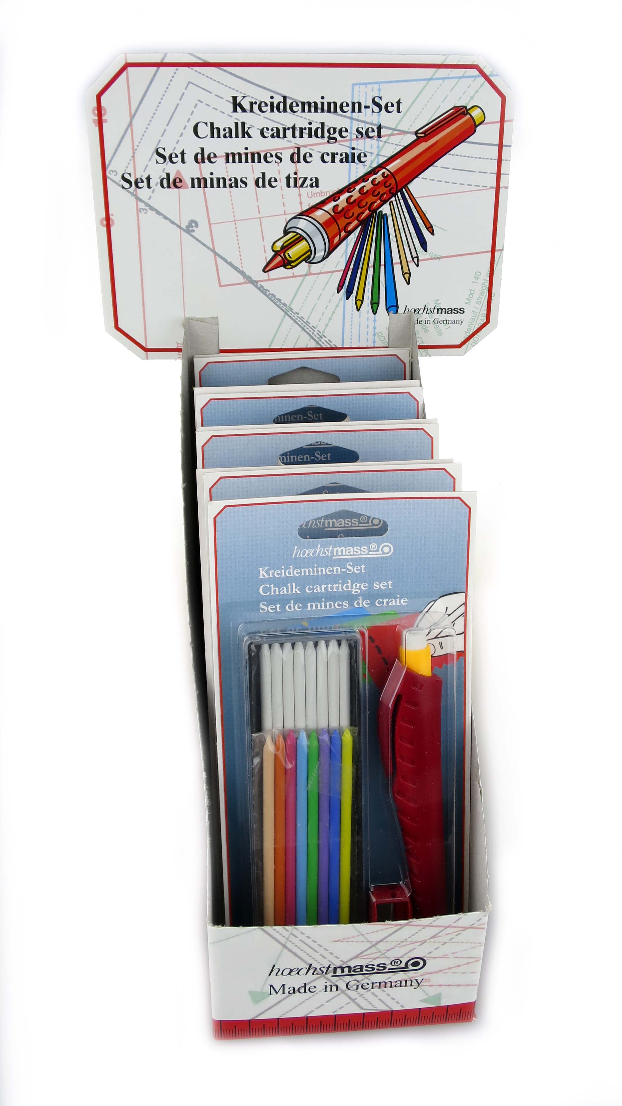Chalk cartridge set with penholder with 17 col. chalk cartridges and pencil sharpener on self-service blister card in display-box