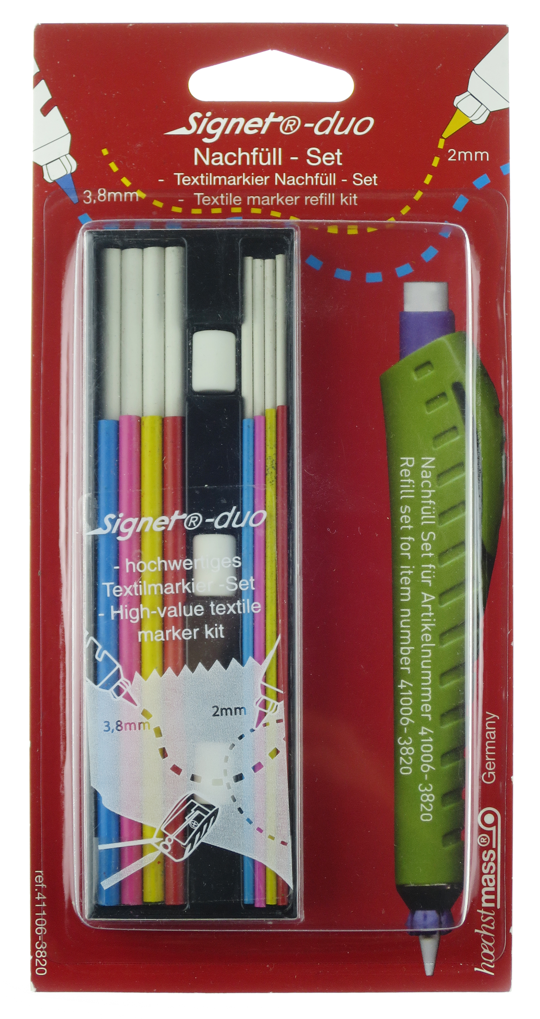 Textile marker set for marking and marking on textiles and other materials with 2 different lead strengths: 2 mm and 3.8 mm.